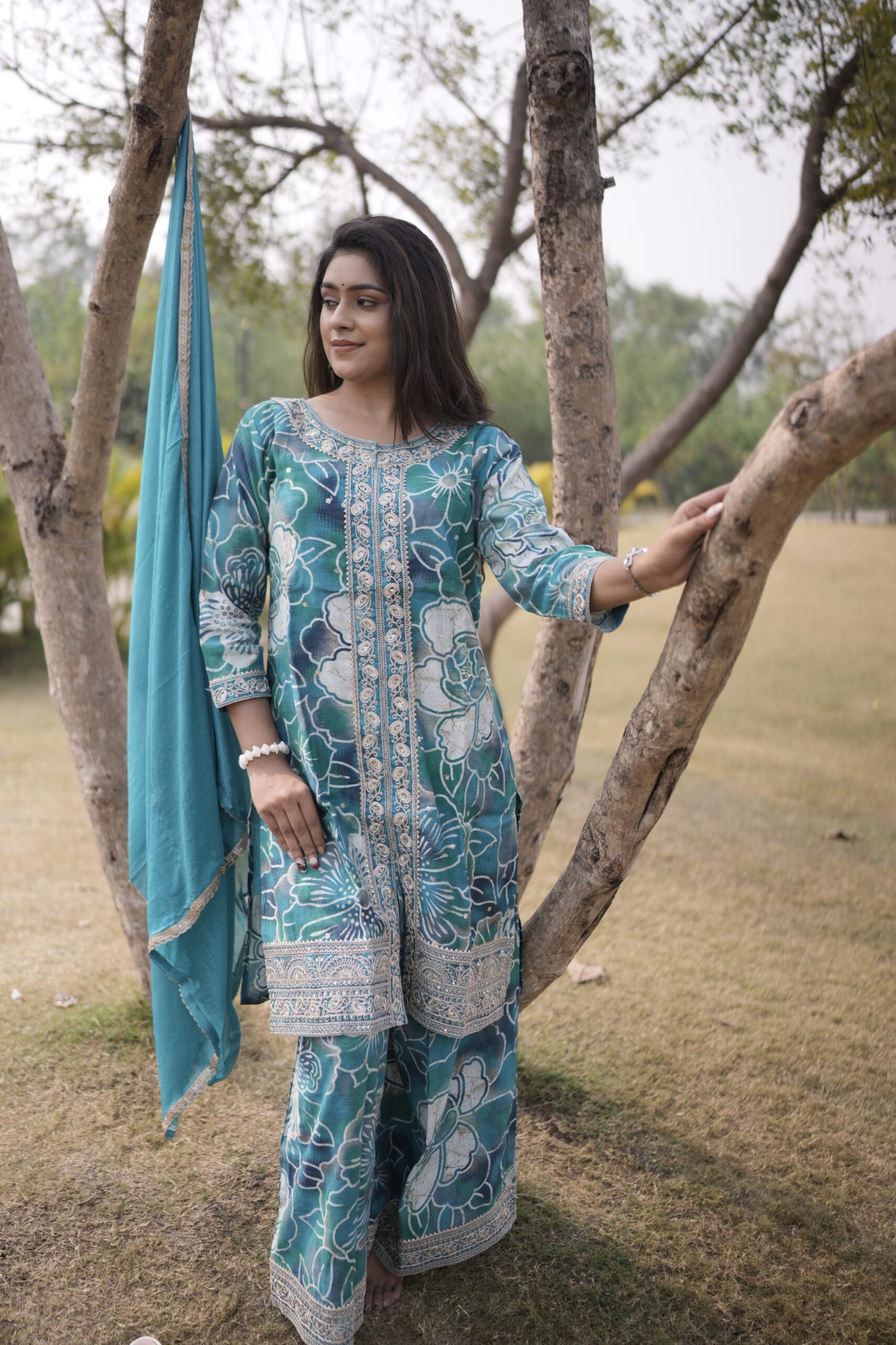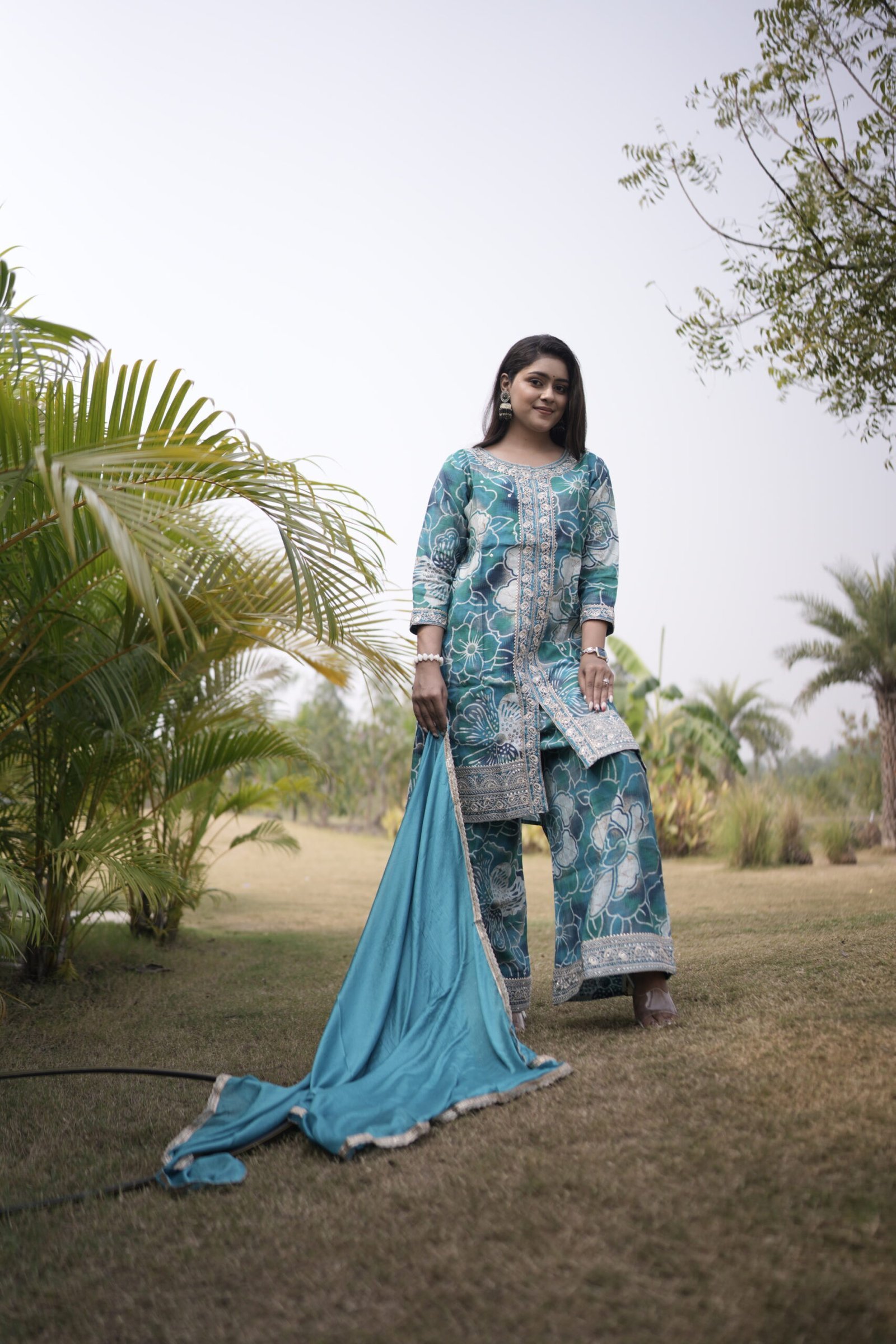 The Aqua Petal Printed Kurta Set is a perfect harmony of elegance and comfort. Crafted from a premium muslin cotton blend, this outfit features refreshing aqua tones adorned with intricate floral prints. The neckline and borders are beautifully highlighted with delicate lace and thread embroidery, adding a touch of refined craftsmanship. The soft chiffon dupatta complements the set with its light, airy texture. Ideal for festive brunches, daytime functions, or casual gatherings, this ensemble embodies effortless grace and vibrant style — making it an ideal choice for women who appreciate classic charm with a modern twist.