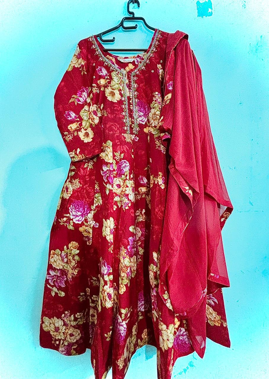 The Crimson Bloom Embroidered Kurta Set captures timeless elegance with its rich crimson hue and delicate floral print. Crafted from a premium muslin cotton blend, it offers a soft texture and natural sheen. The beautifully hand-embroidered neckline with zari and bead detailing adds a luxurious touch to this ensemble. Paired with a matching chiffon dupatta, the outfit flows gracefully, enhancing its festive charm. Ideal for weddings, celebrations, or cultural events, this set blends comfort with regal aesthetics, making it a standout addition to any wardrobe that values tradition with sophistication.