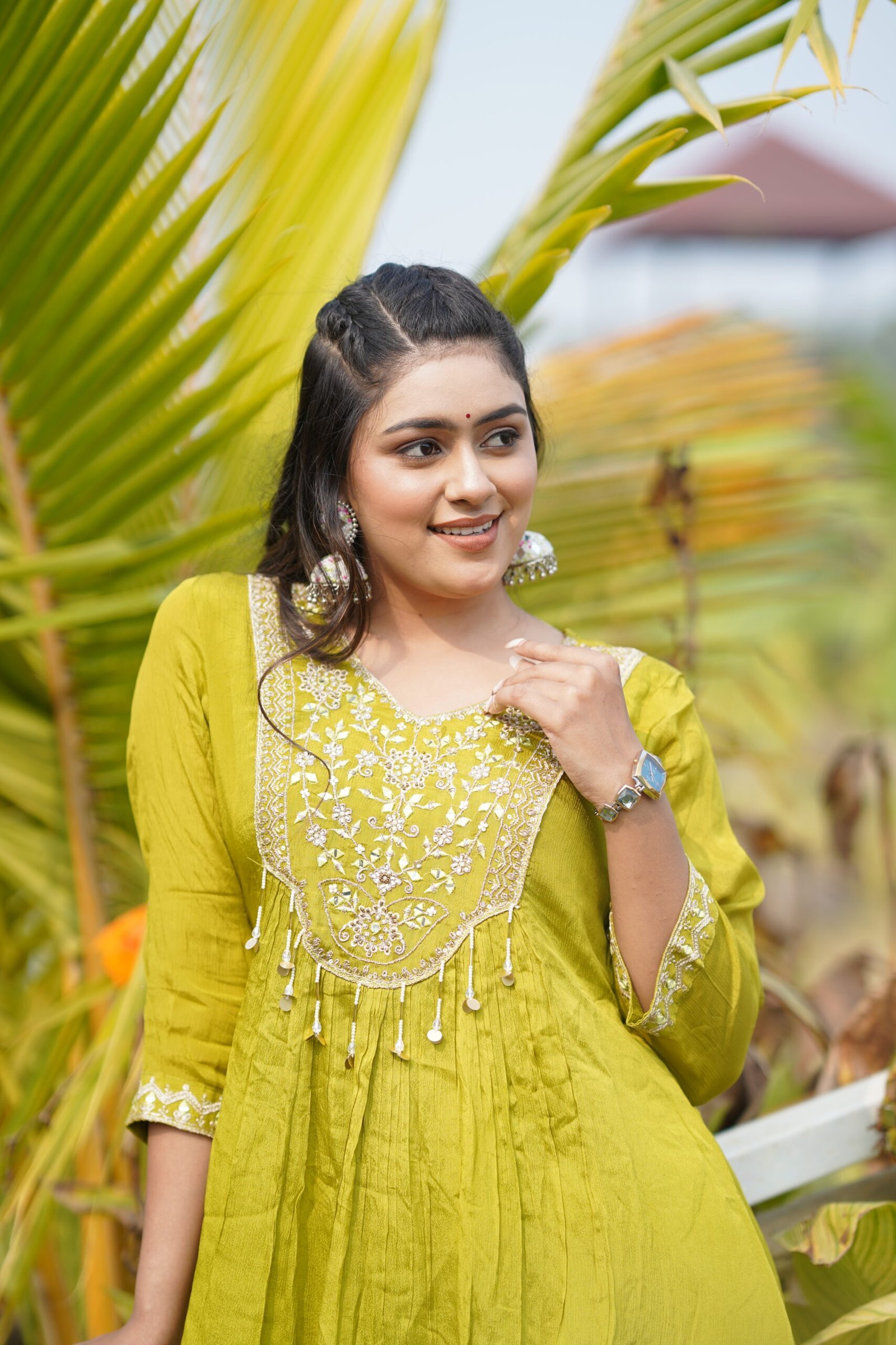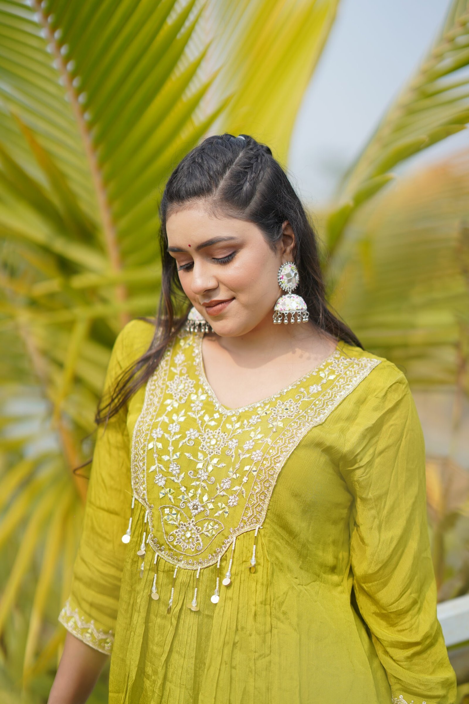 The Meadow Glow Embroidered Kurta Set radiates refreshing beauty and traditional craftsmanship. Designed in a soothing lime green tone, it features intricate thread and mirror embroidery on the neckline and sleeves, adding a festive sparkle. Crafted from premium cotton blend fabric, it ensures maximum comfort while maintaining a refined look. The matching dupatta, adorned with small embroidered motifs, completes the ensemble with understated grace. Perfect for festive occasions, daytime celebrations, or casual gatherings, this kurta set embodies simplicity with elegance, offering a perfect blend of comfort, color, and charm for every modern woman’s ethnic wardrobe.
