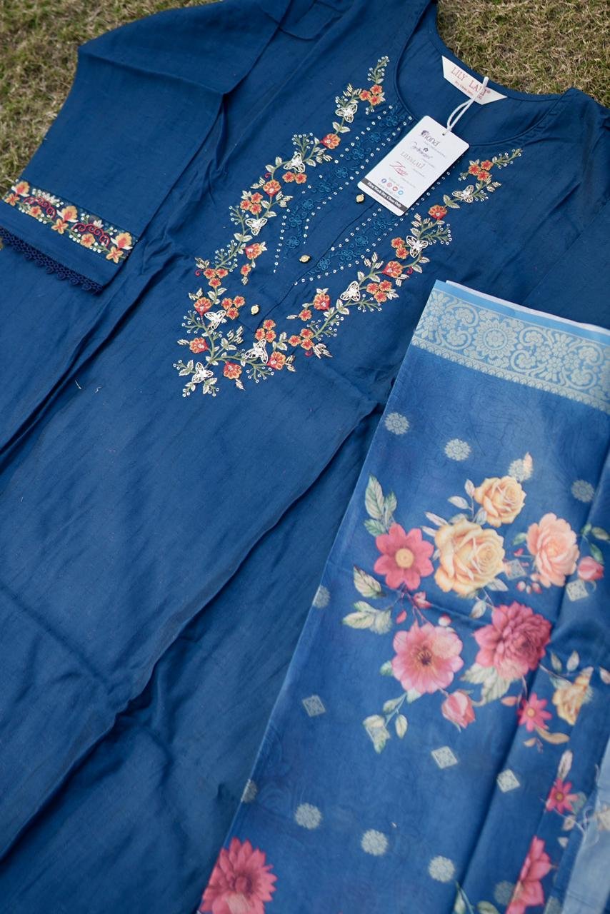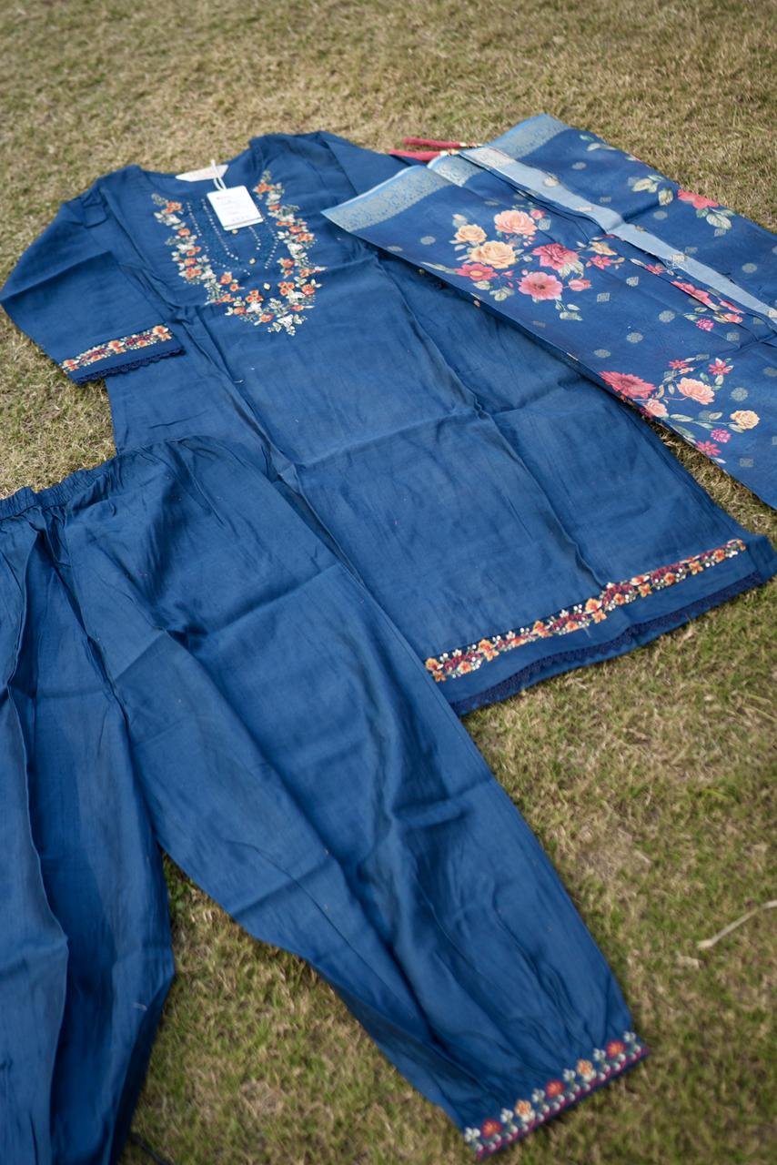 The Midnight Charm Embroidered Kurta Set combines classic grace with a contemporary touch. Crafted from a premium silk-cotton blend, the ensemble features a deep midnight blue base enhanced with intricate multicolor thread embroidery along the neckline, sleeves, and hem. The vibrant floral detailing adds warmth to the elegant tone of the fabric. The look is completed with a soft organza dupatta showcasing exquisite floral digital prints. Perfect for festive occasions, semi-formal events, or family gatherings, this outfit offers a refined balance of comfort and tradition — a must-have for those who appreciate understated luxury and detailed craftsmanship.
